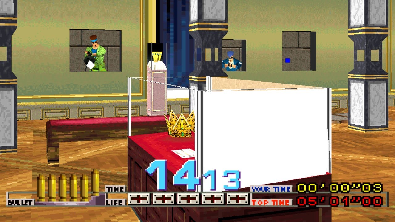Безусловно, помогает то, что в Time Crisis очень весело играть, с чёткой графикой, которая позволяет легко видеть врагов, и простым, интуитивно понятным управлением световым пистолетом. Но то, что действительно делает эту игру особенной, — это ножная педаль и система укрытий — блестящая идея, которая произвела революцию в том, как вы играете в подобные стрелялки.