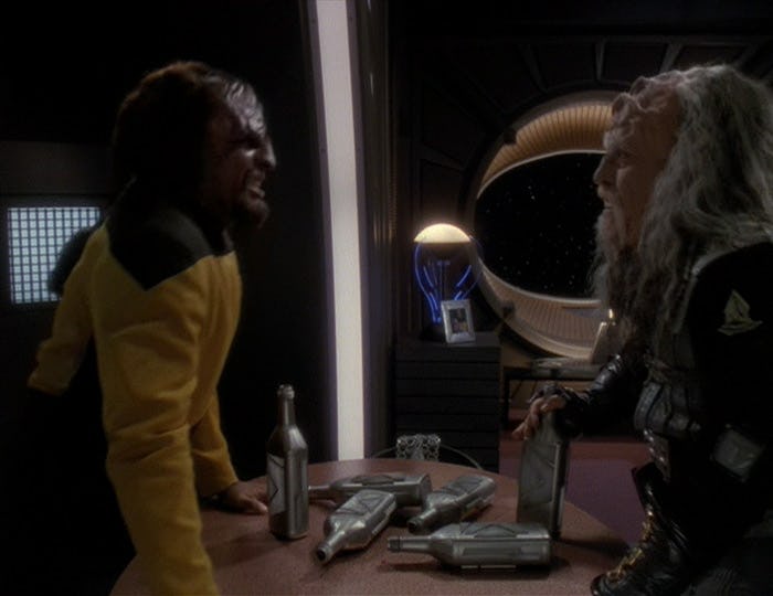 По сути, задание Уорфа краткое. Благодаря своему клингонскому наследию и способности общаться с соплеменниками за выпивкой, он может быстро собрать информацию о флоте, окружающем DS9, и его истинных намерениях. Сюжет требует от зрителей принятия некоторых маловероятных сценариев: действительно ли Сиско специально завербовал Уорфа, чтобы просто напоить клингона и выудить информацию? Кроме того, почему клингоны совершили бы столь заметное прибытие с большим флотом перед началом вторжения в Кардассию? Не было бы логичнее непосредственно отправиться к своей цели?