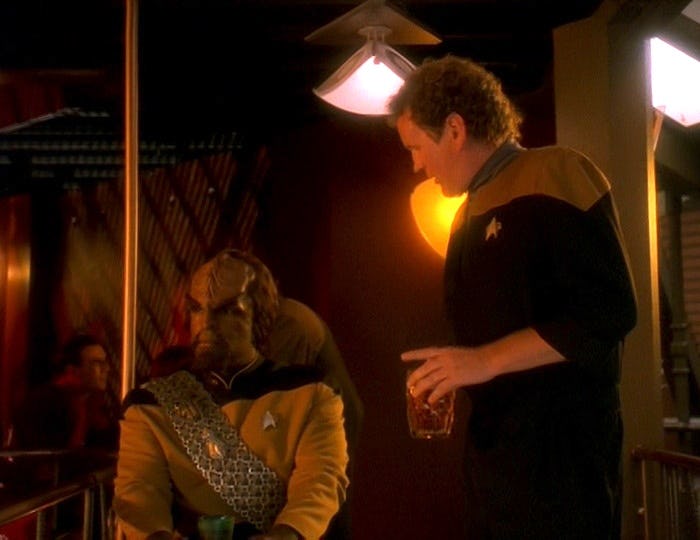 В запоминающейся сцене Ворф и О’Брайен делятся напитком в баре Кварка, вспоминая, как они спасли Пикарда от Боргов в «The Best of Both Worlds, Part II». Хотя в хронологии сериала прошло всего пять лет, учитывая всё, что произошло во вселенной Trek с тех пор, это казалось очень далёким воспоминанием. Ворф говорит О’Брайену, что был уверен в успехе экипажа Enterprise, заявляя: «Мы были как воины из старинных историй — мы чувствовали, что способны на всё.»