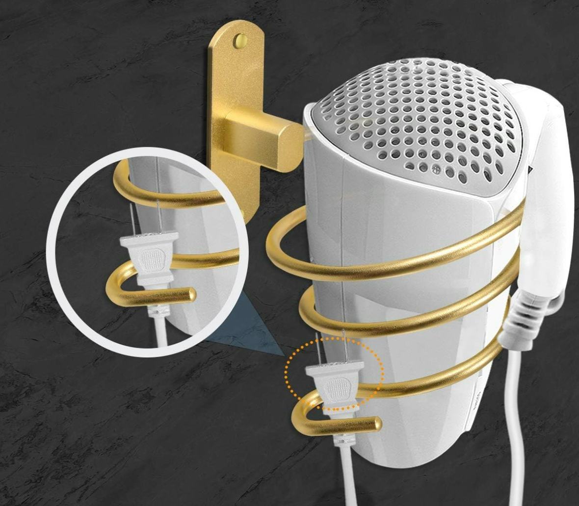Держатель для фена из алюминия, который крепится к стене.