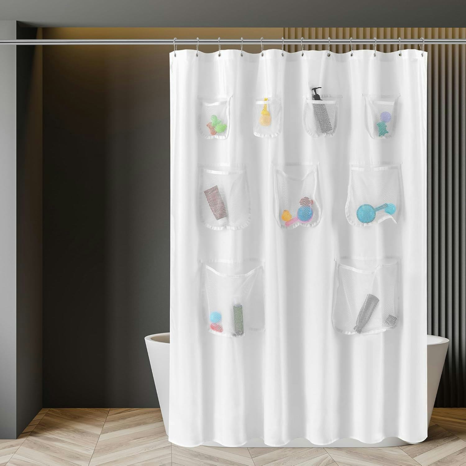 Не хватает места в душе? Эта шторка для душа может помочь! У неё девять сетчатых карманов — идеально подходит для хранения шампуней, бритв, игрушек для ванной и всего, что вы хотите держать под рукой во время принятия душа. Ткань отталкивает воду, поэтому вам не нужна отдельная подкладка. Кроме того, её можно стирать в машине для простой очистки. Прочные металлические люверсы надёжно удерживают шторку на карнизе, даже когда карманы полны. Она доступна в четырёх разных цветах.