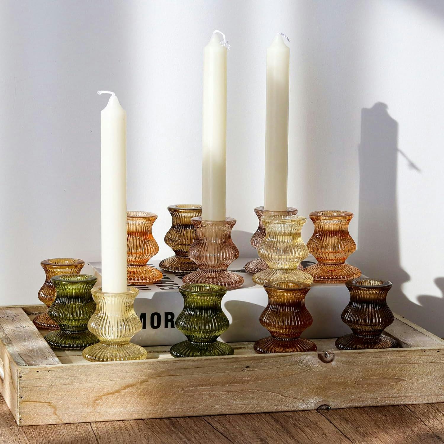 Набор из 12 стеклянных подсвечников в теплых тонах, вдохновленных винтажным стилем.