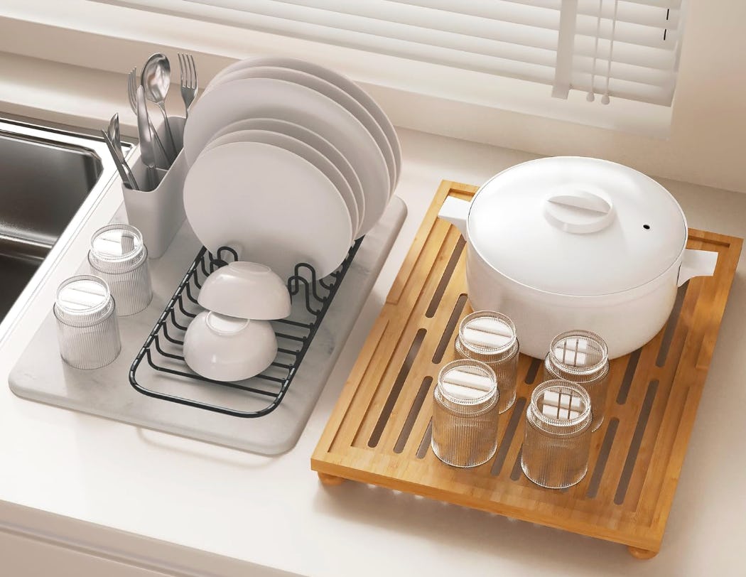 Гладкий каменный коврик для сушки с бамбуковой подставкой для более быстрой и чистой сушки.