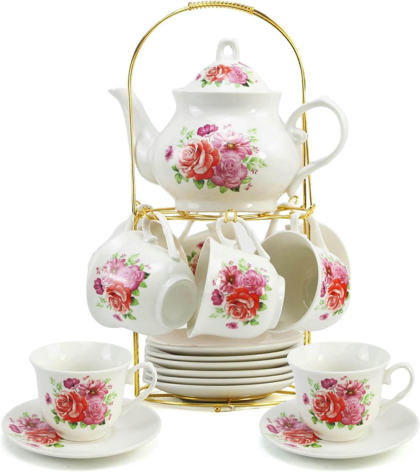 Этот прекрасный 20-ти предметный набор идеально подходит для добавления нотки элегантности в ваш дом, будь то для особых случаев или просто для демонстрации. Каждая чашка и блюдце украшены прекрасным цветочным дизайном, а в набор входит все необходимое для чаепития – чайник, шесть чашек, блюдец и ложек – а также стильная золотая полка для его демонстрации. Это полноценный и легкий способ преобразить любое пространство.