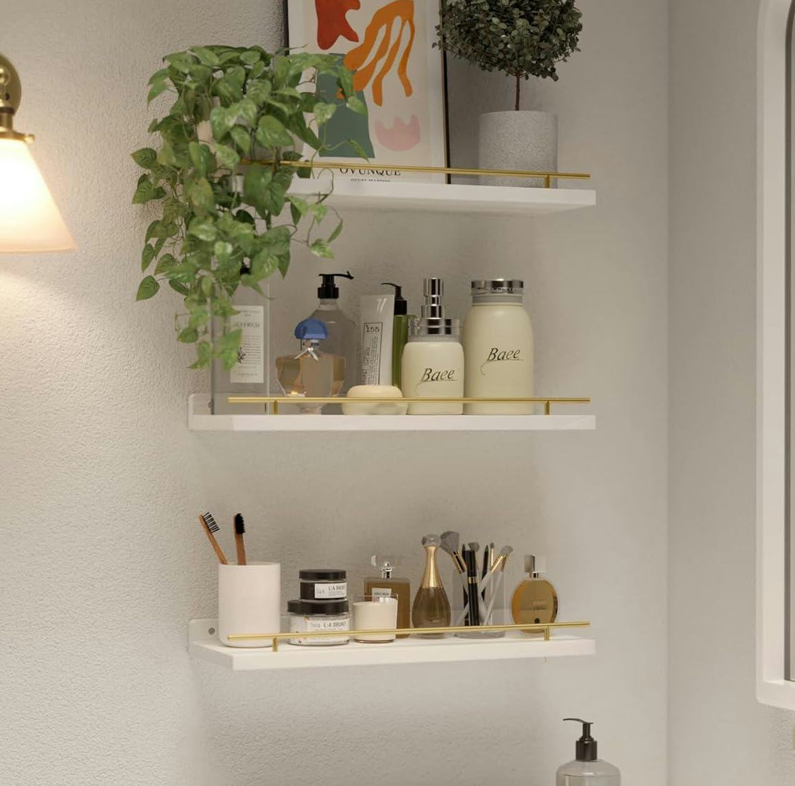 Хотите добавить стильное хранение на свои стены? Этот набор из трех плавающих полок из массива дерева сочетает в себе прочные платформы с элегантными золотыми металлическими направляющими, чтобы надежно удерживать ваши вещи – такие как фотографии или туалетные принадлежности. Имея высокий рейтинг 4.6 звезды, каждая полка может выдерживать до 9 килограммов и легко устанавливается благодаря предварительно просверленным отверстиям и входящему в комплект крепежу. Эти полки одновременно практичны и универсальны, мгновенно улучшая внешний вид любой пустой стены.