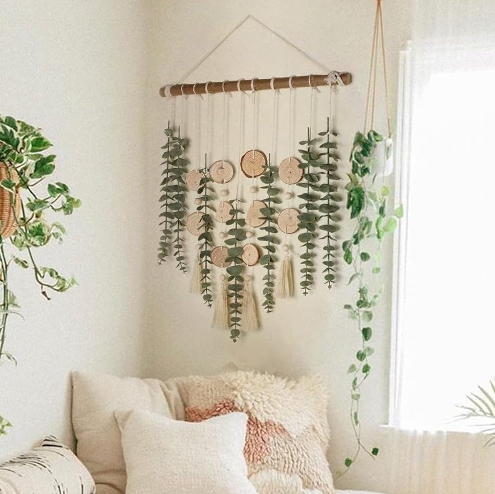 Добавьте нотку естественной красоты в ваш дом с помощью этого ручной работы настенного украшения из эвкалипта. Изготовленное из дерева, реалистичной зелени, бусин и бахромы, оно создает расслабленный и непринужденный стиль. Его мягкие, нейтральные цвета гармонично сочетаются с любым интерьером. Поскольку каждое изделие сделано вручную, оно немного отличается, и оно готово к немедленному использованию – не требует настройки!