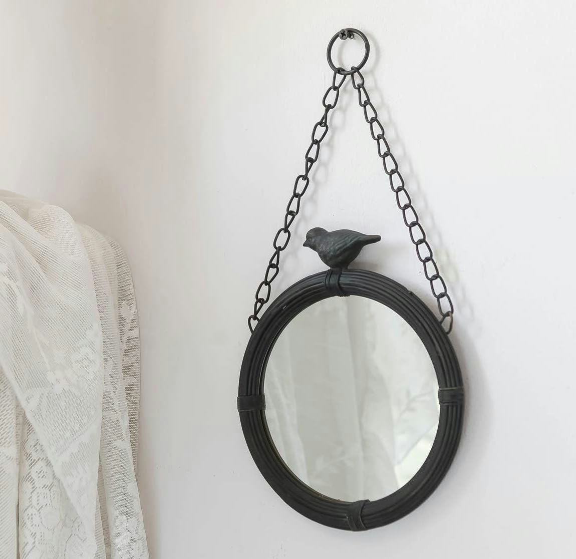 Это небольшое настенное зеркало имеет классический, винтажный вид, идеально подходящий для стиля кантри. Оно имеет круглое зеркало, окруженное слегка состарившейся металлической рамой и украшено очаровательной деталью в виде птицы. Высота 32 см при диаметре зеркала 14 см делает его отличным размером для прихожих, ванных комнат или коридоров. Оно изготовлено из прочной железной рамы и поставляется с цепью и всем необходимым оборудованием для легкой установки.