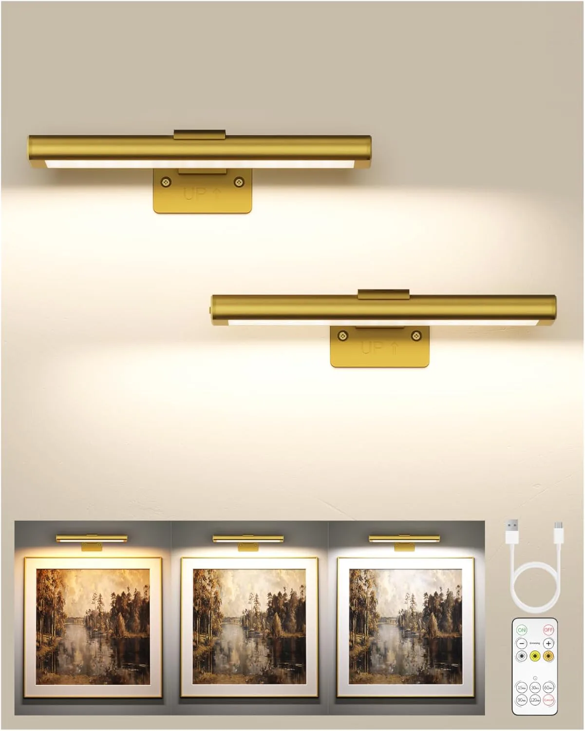 Эти светильники разработаны, чтобы красиво демонстрировать ваши обрамленные произведения искусства и фотографии. Они беспроводные, что избавляет от необходимости в розетках, и поставляются с пультом дистанционного управления для удобного управления. Вы можете регулировать яркость с помощью пяти уровней, выбирать из трех различных цветовых температур и даже устанавливать таймеры. Они быстро устанавливаются, а магнитные крепления упрощают их снятие для подзарядки. Мгновенно преобразите свои стены и придайте им профессионально подобранный вид.