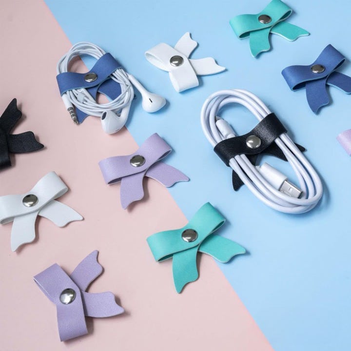 Сохраняйте свои кабели аккуратными и без спутывания с помощью этих стильных органайзеров для шнуров! Они оборачиваются вокруг USB-кабелей, наушников, зарядных устройств и других шнуров, а затем застегиваются, чтобы все было аккуратно. Изготовлены из искусственной кожи и имеют форму бантиков, они доступны в десяти цветах и двух размерах, продаются упаковками по пять штук.