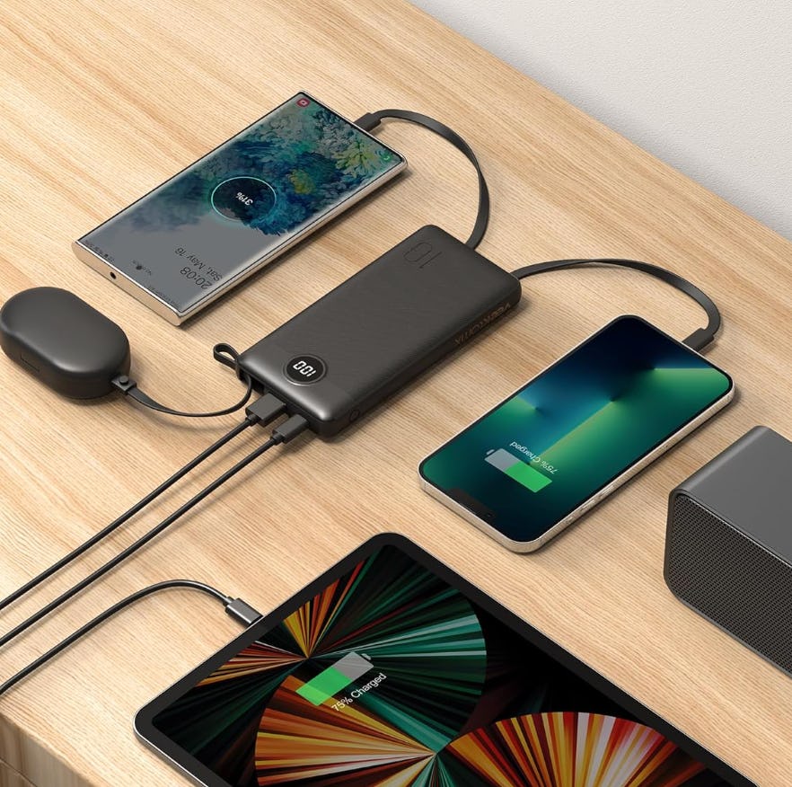 Этот power bank разработан для зарядки на ходу и включает в себя четыре кабеля для одновременной зарядки нескольких устройств. Он работает с iPhone, Samsung phones, Google Pixels, iPads, AirPods и многими другими гаджетами. Кроме того, он может быстро зарядить ваш iPhone до 50% всего за полчаса. Он также оснащен функциями безопасности для предотвращения перегрева и перезарядки.