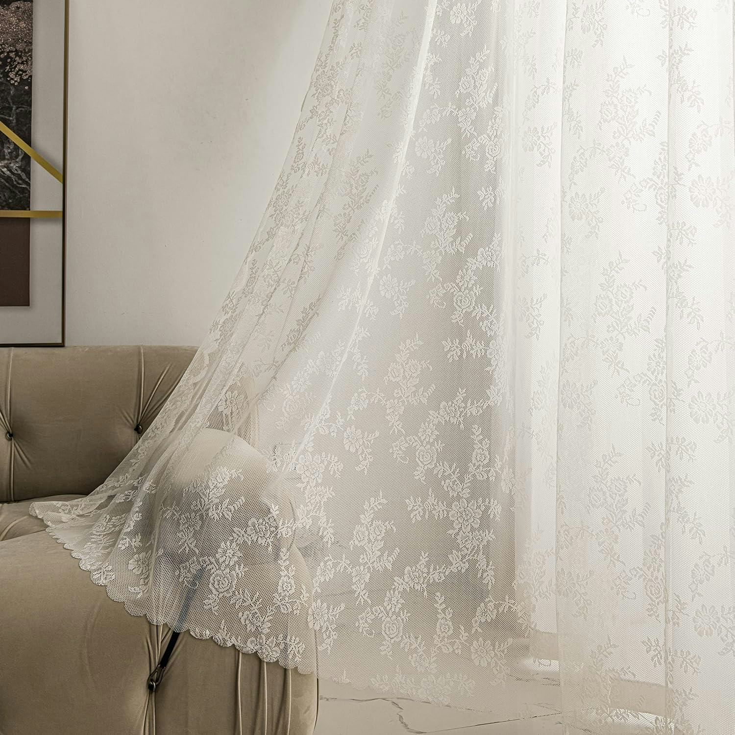 Эти кружевные занавески обеспечивают большую приватность и мягко фильтруют солнечный свет. Благодаря их нежной вышивке в винтажном стиле, они добавляют классический штрих в любую комнату. Они доступны в 19 цветах и различных длинах, что позволяет легко найти идеальное соответствие вашему интерьеру.