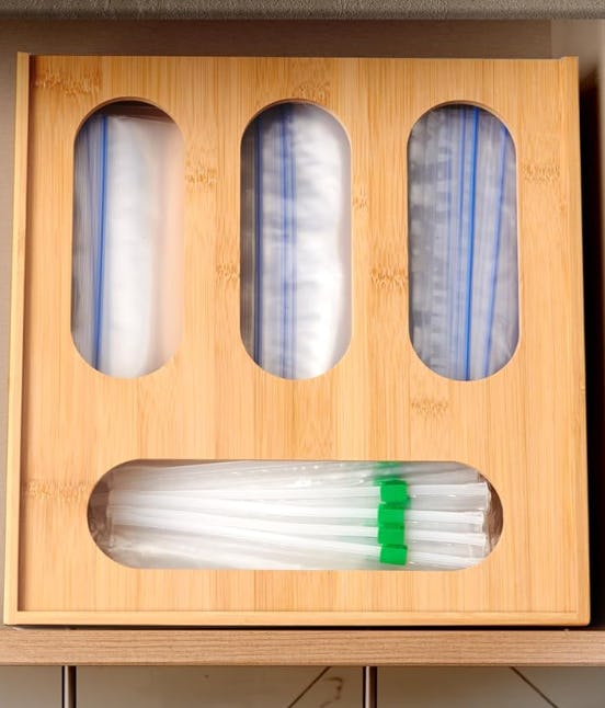 Окей, так что этот органайзер для пакетов просто потрясающий, потому что он разделен на четыре секции, каждая из которых четко обозначена. Это означает, что я могу мгновенно взять пакет нужного размера, не копаясь в поисках. Кроме того, сам чехол сделан из бамбука и имеет скользящую крышку, что делает его повторное наполнение супер простым. Честно говоря, это действительно аккуратная конструкция.