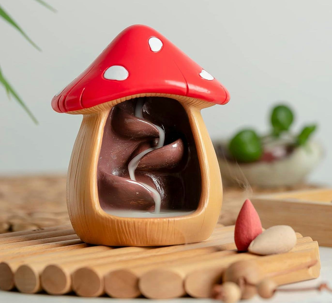 Любители благовоний, вам это понравится! Эта подставка в форме гриба идеально подходит для благовоний в конусах. Она гениально спроектирована с многоуровневым основанием, которое позволяет дыму стекать вниз, как небольшой водопад. Изготовленная из цельного смолы и расписанная вручную, это красивый и функциональный предмет.
