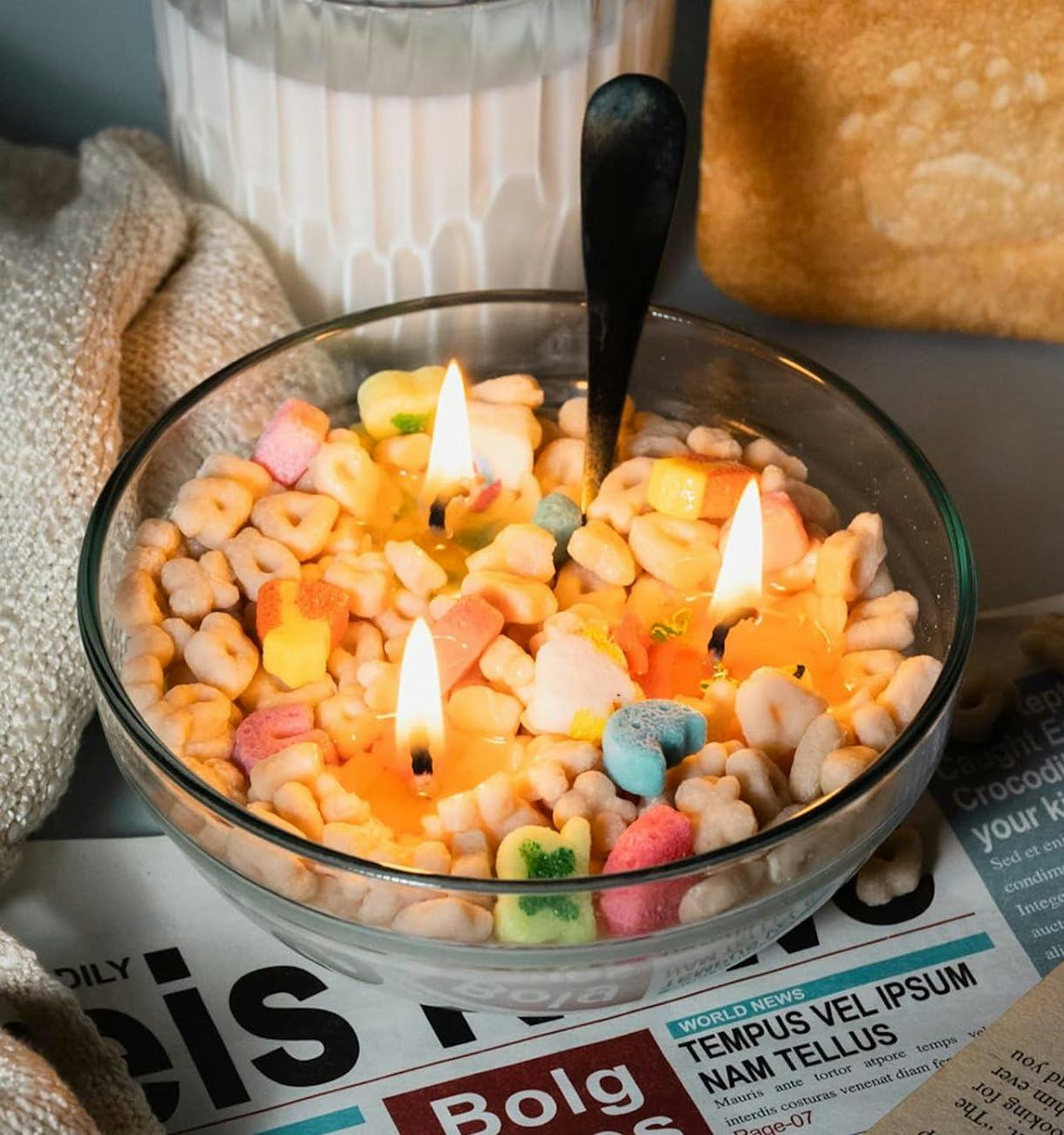 Игривая свеча в виде миски с хлопьями, которая выглядит достаточно аппетитно, чтобы её съесть.