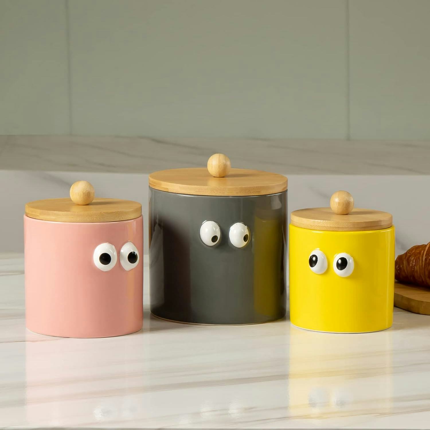 Эти забавные кухонные контейнеры с глазками наверняка оживят ваше пространство и вызовут улыбку! Они изготовлены из керамики с бамбуковыми крышками и имеют очаровательный дизайн с широко раскрытыми глазами. Они идеально подходят для хранения кофе, муки, сахара, печенья или любых других сухих продуктов.