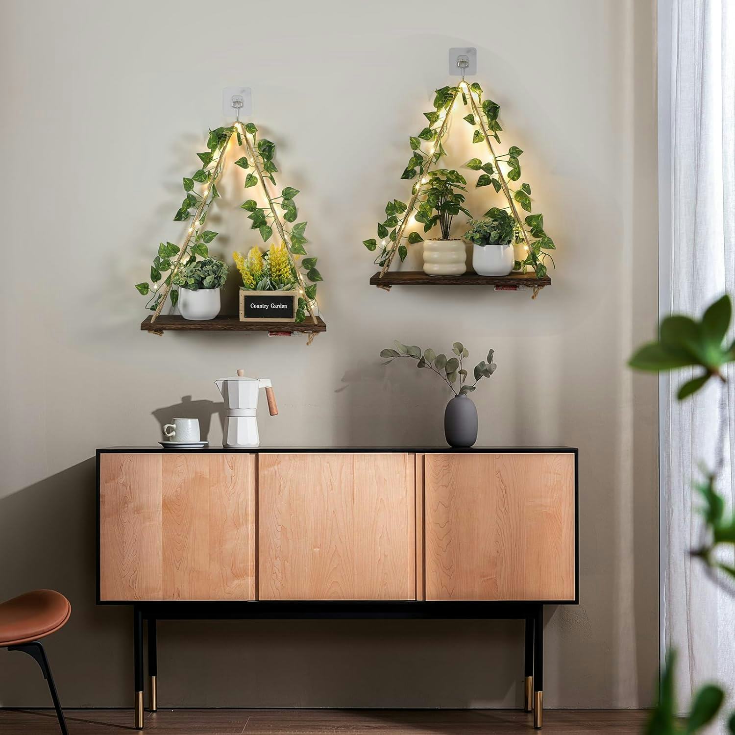 Окей, я только что получил эти полки, и они реально крутые. Они сделаны из натурального дерева, что просто отлично, и для подвешивания используются толстые конопляные канаты – это создает очень естественную и уютную атмосферу. К тому же, их было супер легко установить! Лучшая часть? Они поставляются с искусственными лианами и маленькими гирляндами, так что я смог мгновенно добавить теплое освещение и зелень в свою игровую настройку, не разорившись. Это целое настроение!