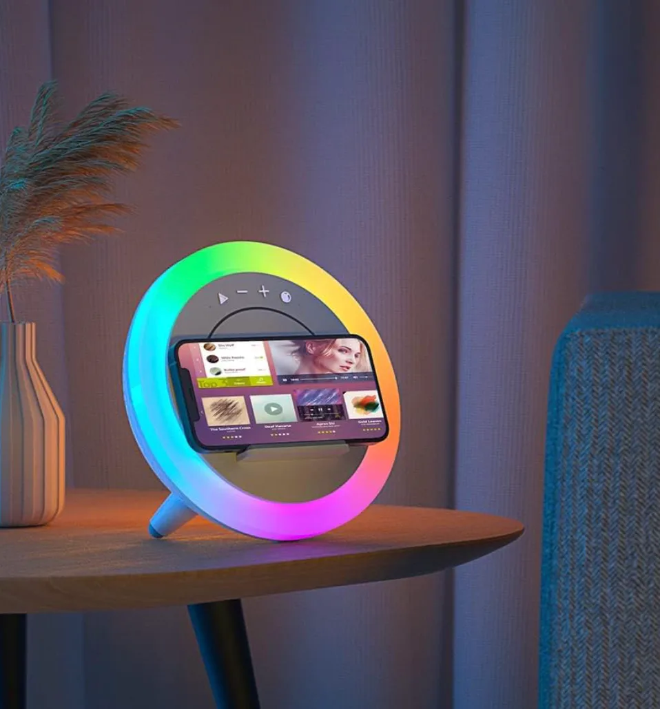 Этот прикроватный гаджет объединяет четыре полезные функции в одном элегантном устройстве. Это Bluetooth-колонки, ночник, светящийся несколькими цветами, беспроводная зарядка для вашего телефона и подставка для телефона – всё в одном. Вы можете легко заряжать свой телефон, просматривая видео под удобным углом, и настроить настроение с помощью семи различных однотонных цветов или двух анимированных световых эффектов.