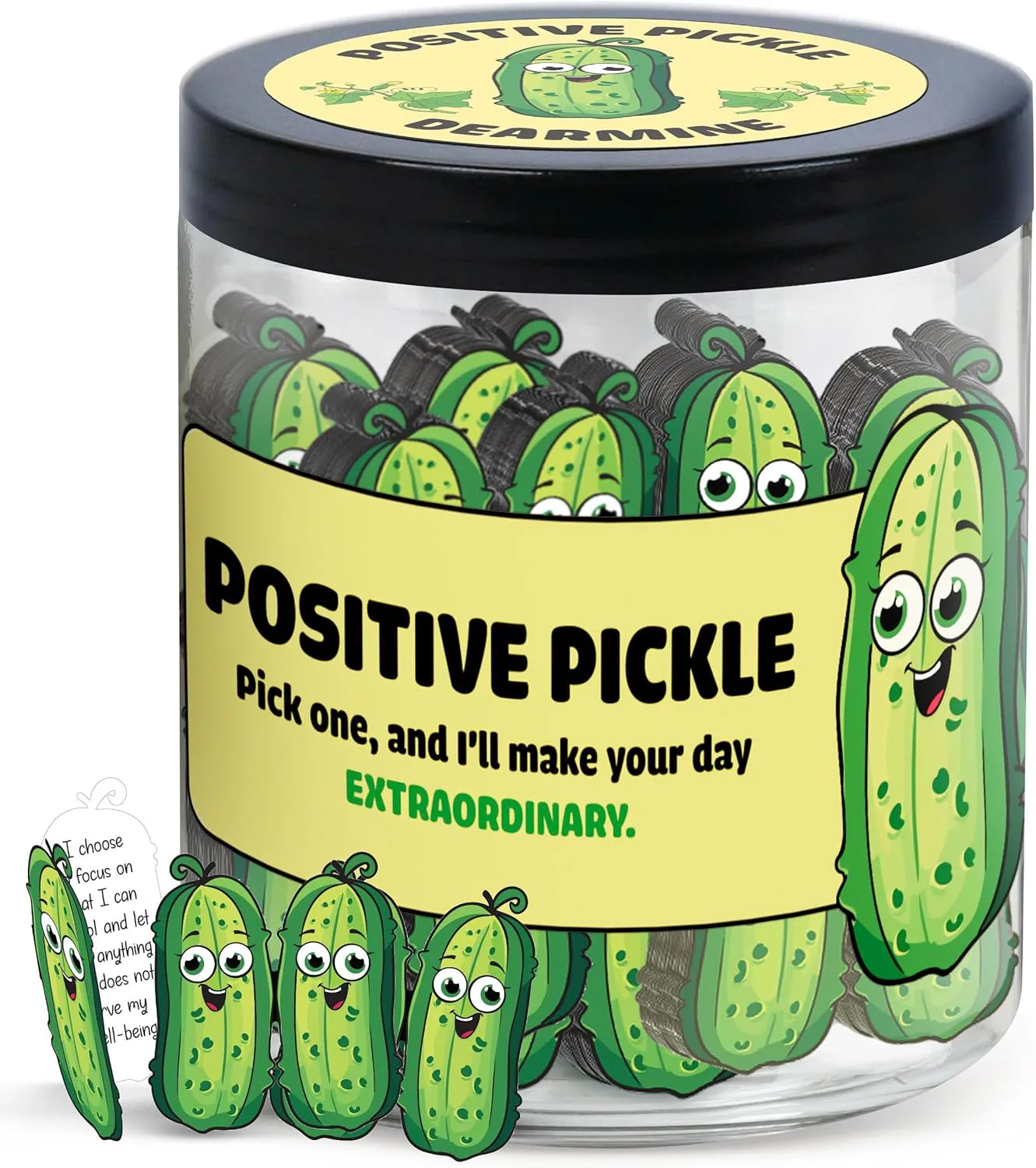 Банка с позитивными карточками с причудливой темой солёных огурцов.