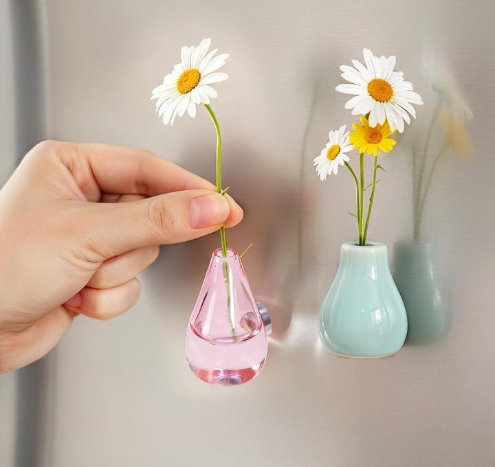 Эти крошечные магнитные вазы – милый способ добавить нотку цветочной красоты на вашу холодильник! Каждая керамическая ваза имеет сильный магнит, который удерживает маленькие цветы или стебли, а также может использоваться для демонстрации заметок или фотографий. Они крепко держатся, но легко снимаются. В комплект входят пять красочных ваз и несколько искусственных цветов.