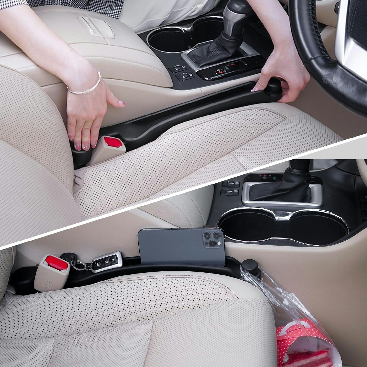 Эти удобные вкладыши помещаются между сиденьями вашего автомобиля и центральной консолью, создавая дополнительное место для хранения. Они также предотвращают скольжение и потерю вещей. Вы можете легко перевернуть их – одна сторона предлагает карманы для хранения, а другая обеспечивает гладкий, аккуратный внешний вид.
