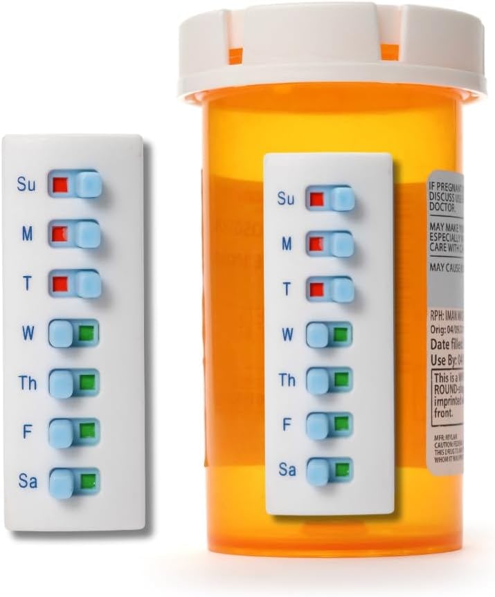 Эти трекеры для лекарств – удобная и компактная альтернатива традиционным таблетницам. Они легко крепятся к флаконам с лекарствами и имеют семь ползунков – по одному на каждый день недели – чтобы вы могли быстро проверить, приняли ли вы лекарство. Кроме того, их можно использовать повторно на новых флаконах до 12 раз.