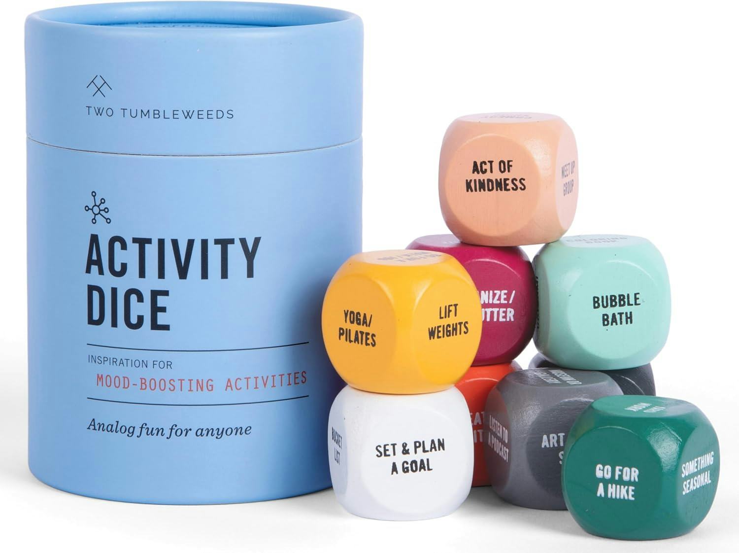 Нужна забавная идея? Этот набор включает в себя девять красочных кубиков, каждый из которых связан с разной категорией, такой как природа, движение или еда. Когда вам скучно, просто бросьте кубики для мгновенного вдохновения! Они предлагают предложения, начиная от простых занятий, таких как посадка семени, и заканчивая более увлекательными, такими как посещение комедийного шоу или воссоздание любимого рецепта из детства.