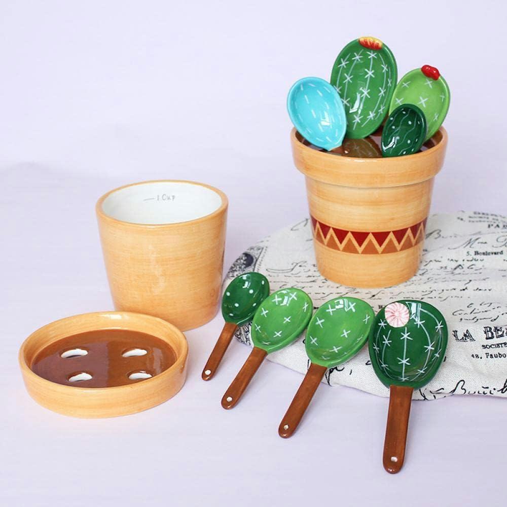 Измерительные ложки в виде кактусов, которые поставляются в фарфоровой вазе для хранения.