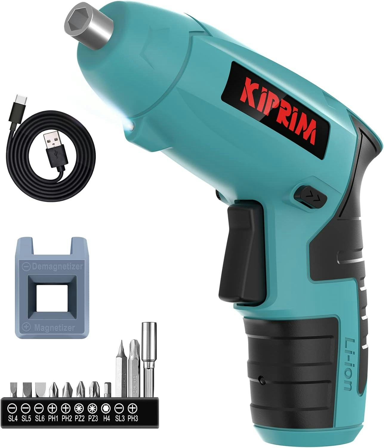 Эта удобная беспроводная отвёртка оснащена встроенным светодиодным фонарём, который поможет вам видеть в тёмных местах. Она работает от перезаряжаемой батареи на 4 В, обеспечивающей достаточную мощность, а индикатор позволяет легко проверить уровень заряда батареи. Также в комплекте идёт набор различных бит, хранящихся прямо внутри.