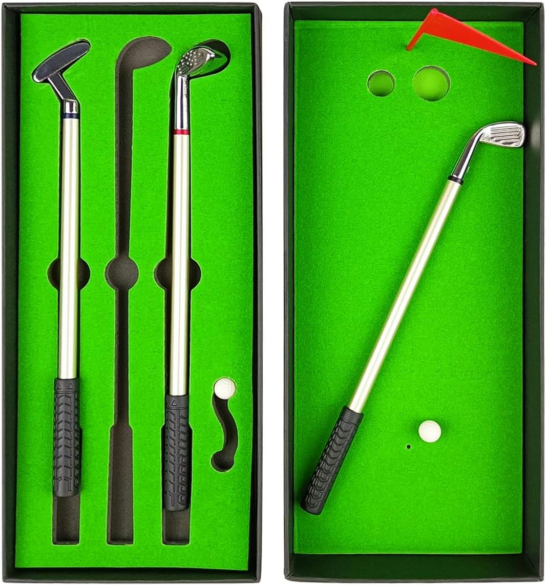 Этот забавный набор ручек идеально подходит для небольшого развлечения прямо на рабочем столе! В него входят три ручки в форме клюшек для гольфа – с красными, синими и черными чернилами – а также два миниатюрных мячика для гольфа и маленький флажок, все аккуратно упаковано в зеленую коробку из фетра. Ручки действительно пишут, так что вы можете записывать идеи и немного развлечься между встречами. Это отличный и практичный подарок для всех, кто любит что-то покрутить в руках в течение дня.