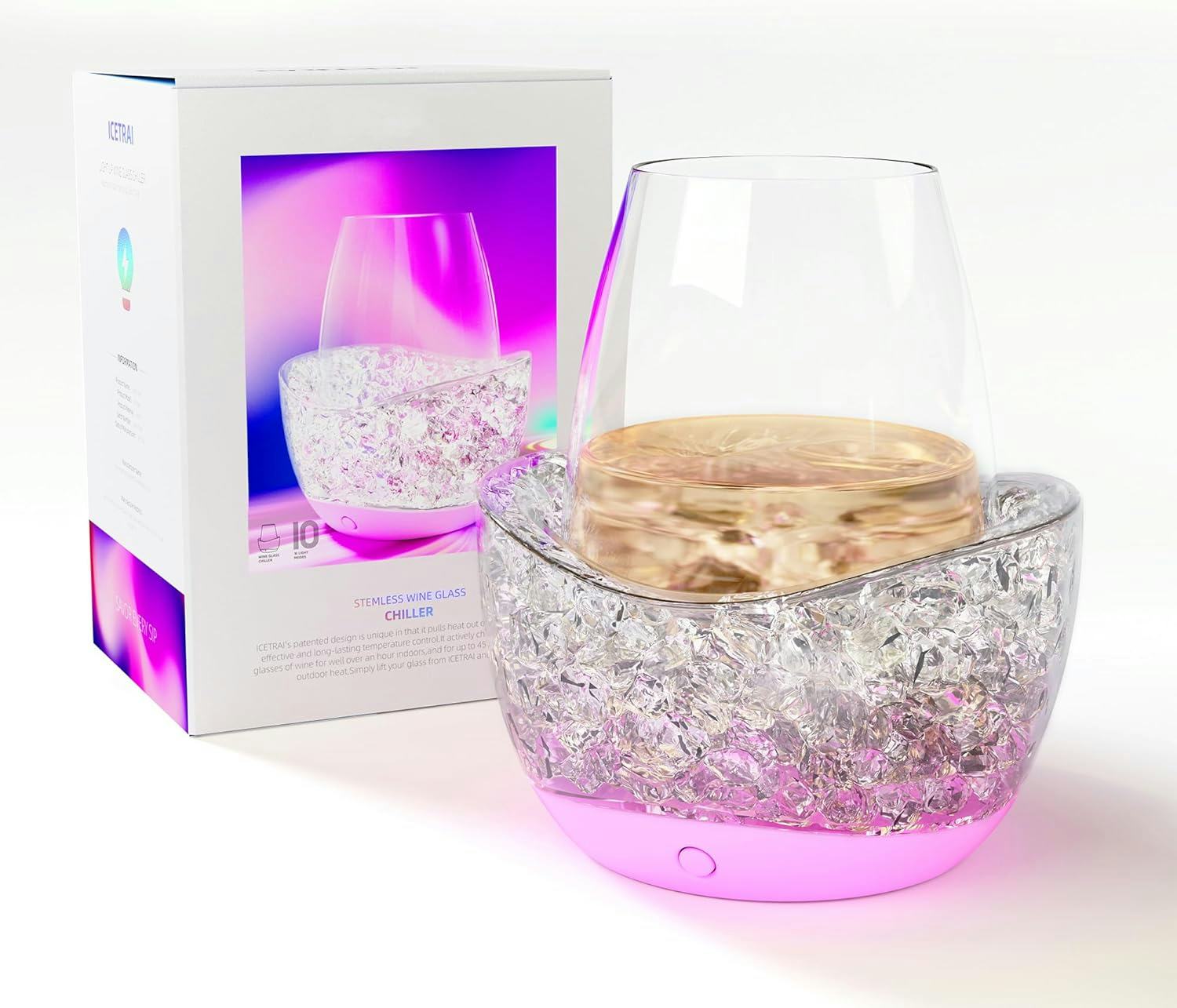 Сохраняйте ваши напитки идеально охлажденными с помощью этого удобного охладителя для винных бокалов! Просто заморозьте основание более двух часов, затем вставьте входящий в комплект бокал (или уже имеющийся у вас), чтобы ваш напиток оставался холодным до часа. Весёлый, красочный светодиодный свет — приятное дополнение.