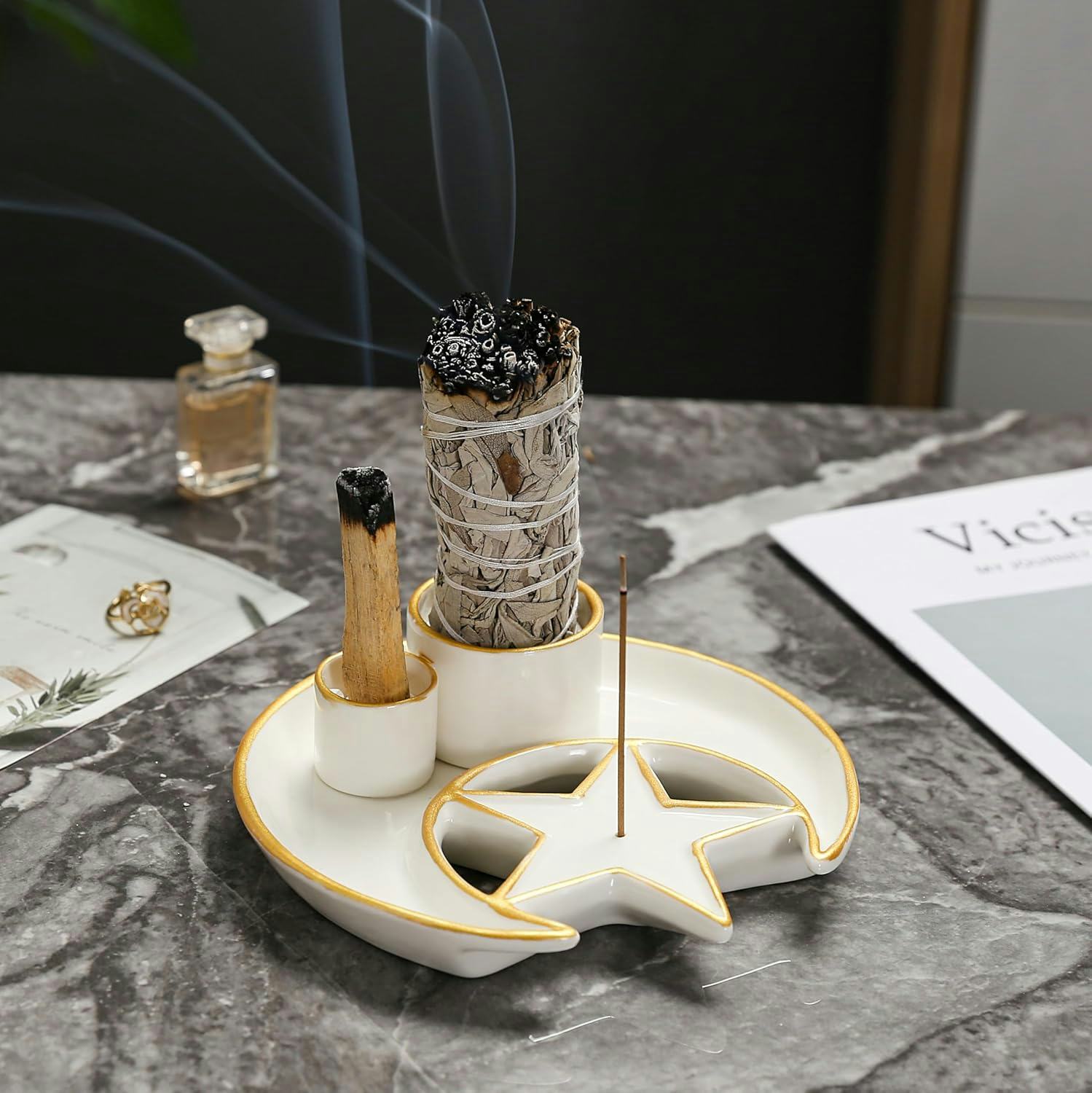Эта подставка для благовоний – прекрасный акцентный элемент с золотыми деталями и узором из звезд и луны. Она также невероятно универсальна – вы можете использовать ее с шалфеем, пало санто, конусным благовонием или традиционными благовониями. Один из покупателей сказал, что в реальности она выглядит еще лучше!