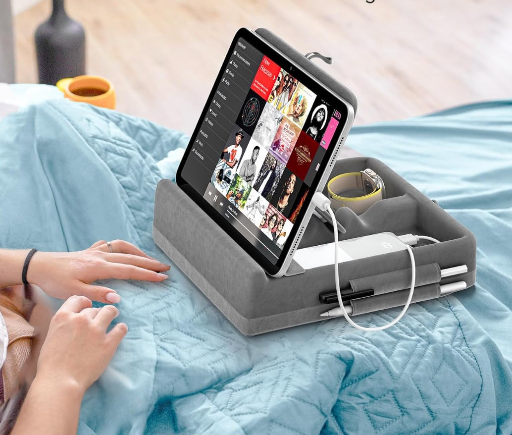 Эта удобная подставка словно подушка для вашего планшета, позволяющая установить его под тремя разными углами – идеально подходит для просмотра шоу или просмотра социальных сетей, расслабляясь в постели или на диване. Также в неё встроено два больших подноса для хранения таких вещей, как закуски или ваш телефон.