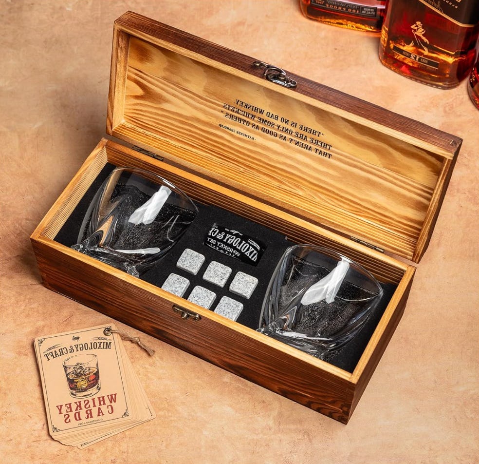 Этот набор для виски идеально подходит, если вам нравится наслаждаться напитком перед сном. Он включает в себя два хрустальных бокала, а также полезные дополнения, такие как силиконовые подставки под стаканы, идеи рецептов и гранитные охлаждающие камни, чтобы ваш виски оставался идеально прохладным. Все это красиво упаковано в деревянную коробку.
