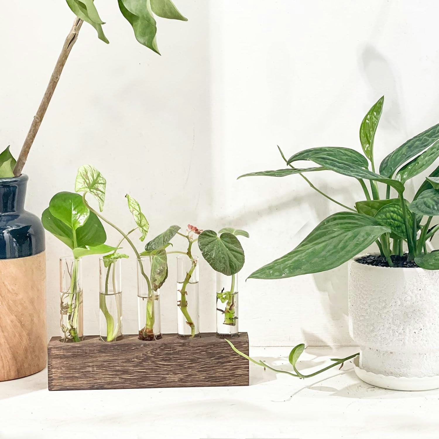 Этот привлекательный растительный террариум достаточно мал, чтобы легко поместиться на столе или подоконнике. Он оснащен пятью стеклянными трубками, идеально подходящими для здорового роста корней, и стильным деревянным основанием.