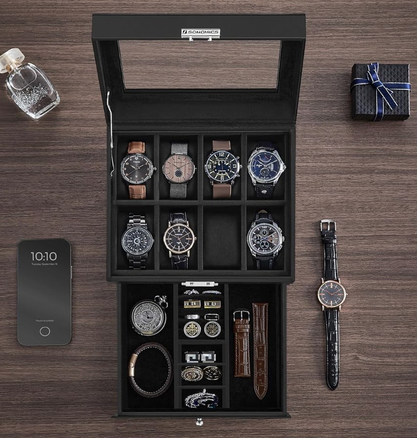 Эта коробка для часов идеально подходит для защиты и организации вашей коллекции. Она вмещает до восьми часов сверху и имеет дополнительное пространство внизу. Мягкие велюровые подушечки и мягкая внутренняя отделка защищают ваши часы от царапин, а прозрачная крышка защищает от пыли.