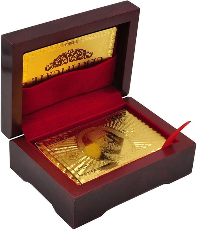 Начать разбиратьсяЗолотые игральные карты, которые поставляются в подарочной деревянной коробке.