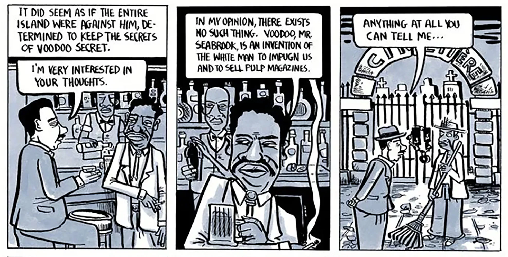 Моя партнерша поняла, что это моя книга, и именно так мы связались с Джо Оллманом, чей графический роман, The Abominable Mr. Seabrook, мы показываем и анимируем в фильме. Некоторые из этих связей произошли совершенно случайно. Было трудно сузить весь объем информации, и многие говорили мне, что история слишком сложна. Я знал, что это большой проект, но был полон решимости рассказать его. Мне удалось упростить задачу, сотрудничая с отличными редакторами, которые помогли мне разбить историю на части. Это было непросто, но я верю, что мы преуспели.