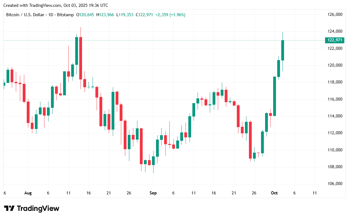 Bitcoin был оценен в $122,958.26 на момент публикации, что на 1.62% выше за 24 часа и также на 12.55% выше за семь дней, согласно данным Coinmarketcap. Цифровой актив колебался между $119,344.31 и $123,944.70 с вчерашнего дня. 😎