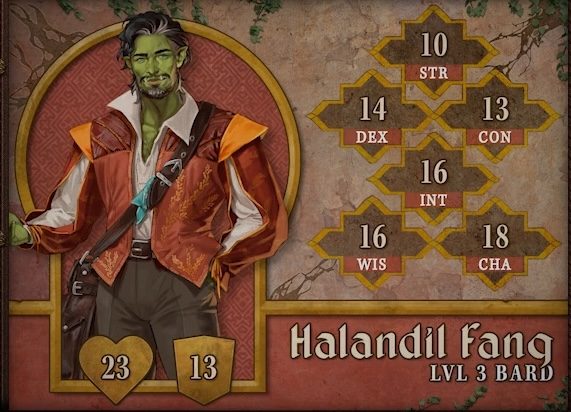 Персонаж Лиама О’Брайена в Critical Role Campaign 4, Халандил Фанг, — орк-бард. По сути, это означает, что он больше склонен к романтике и музыке, чем к сражениям — и его характеристики это подтверждают. У Халандила невероятно высокий показатель Харизмы, но его Сила довольно низкая… что делает его уязвимым в бою. Надеемся, Халандил сможет сосредоточиться на выступлениях и держаться подальше от опасности.