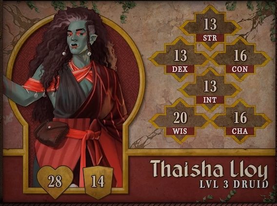 Персонаж Аабрии Иенгар, Тайша Ллой, в Critical Role Campaign 4, — орк-друид, который в настоящее время 3-го уровня. Друиды обычно не известны как сильные бойцы, и Тайша не исключение — её Класс Брони и Сила довольно низки. Однако Тайша преуспевает в интеллекте и личности; её высокие показатели Мудрости и Харизмы делают её самым проницательным человеком вокруг, и её мнения определенно стоит выслушать. Кроме того, она немного более вынослива, чем Халандил, отец её ребенка, и это здорово видеть.