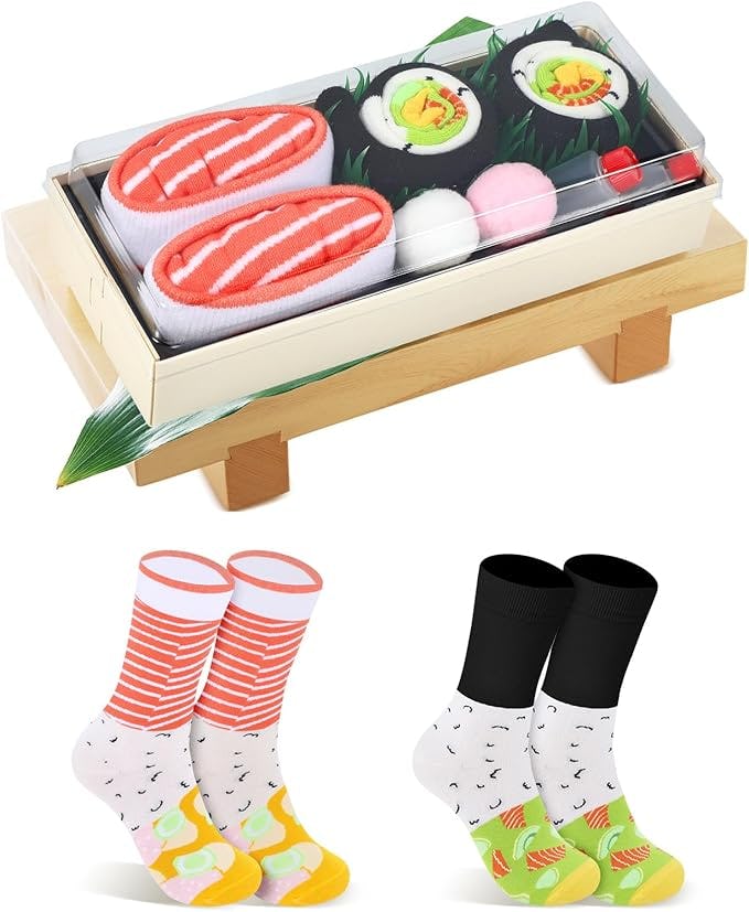 Представьте себе коробку с суши… но наполненную носками! Эти остроумные носки свернуты и упакованы так, чтобы выглядеть точно как роллы маки, с вышитыми деталями, такими как лосось, огурец и морские водоросли. Это забавный и уникальный подарок, но они также удивительно удобны и сделаны из дышащей хлопковой смеси – так что вы действительно можете их носить!
