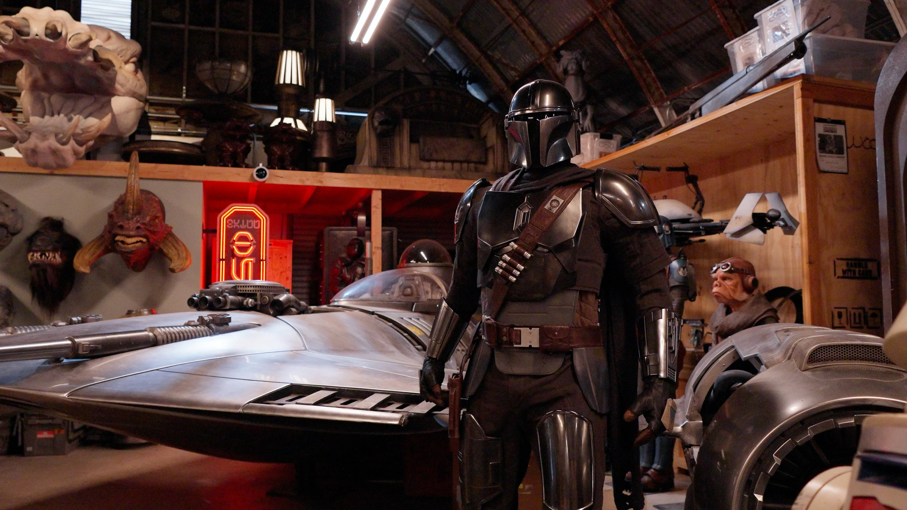 Начать разбиратьсяЧто действительно выделяется, так это броня Дина Джарина, выставленная в комнате, переполненной коллекционными предметами из Star Wars – её хватит, чтобы наполнить лёгкие банты! Я заметил существ из фильмов, таких как нексу, напавший на Падме в Attack of the Clones, и даже, кажется, голову таунтуна из оригинальной трилогии. Большинство предметов, однако, происходят из различных шоу. Если что-то появилось даже на мгновение в The Mandalorian, The Book of Boba Fett или Skeleton Crew, вы найдёте это здесь: головы инопланетян и дроидов, бластеры, световые мечи и модели кораблей. Но главным, по крайней мере для меня как поклонника Набу, является полномасштабная реплика звёздного истребителя N-1, на котором Дин летает в The Book of Boba Fett – он почти полностью точен и действительно впечатляет.