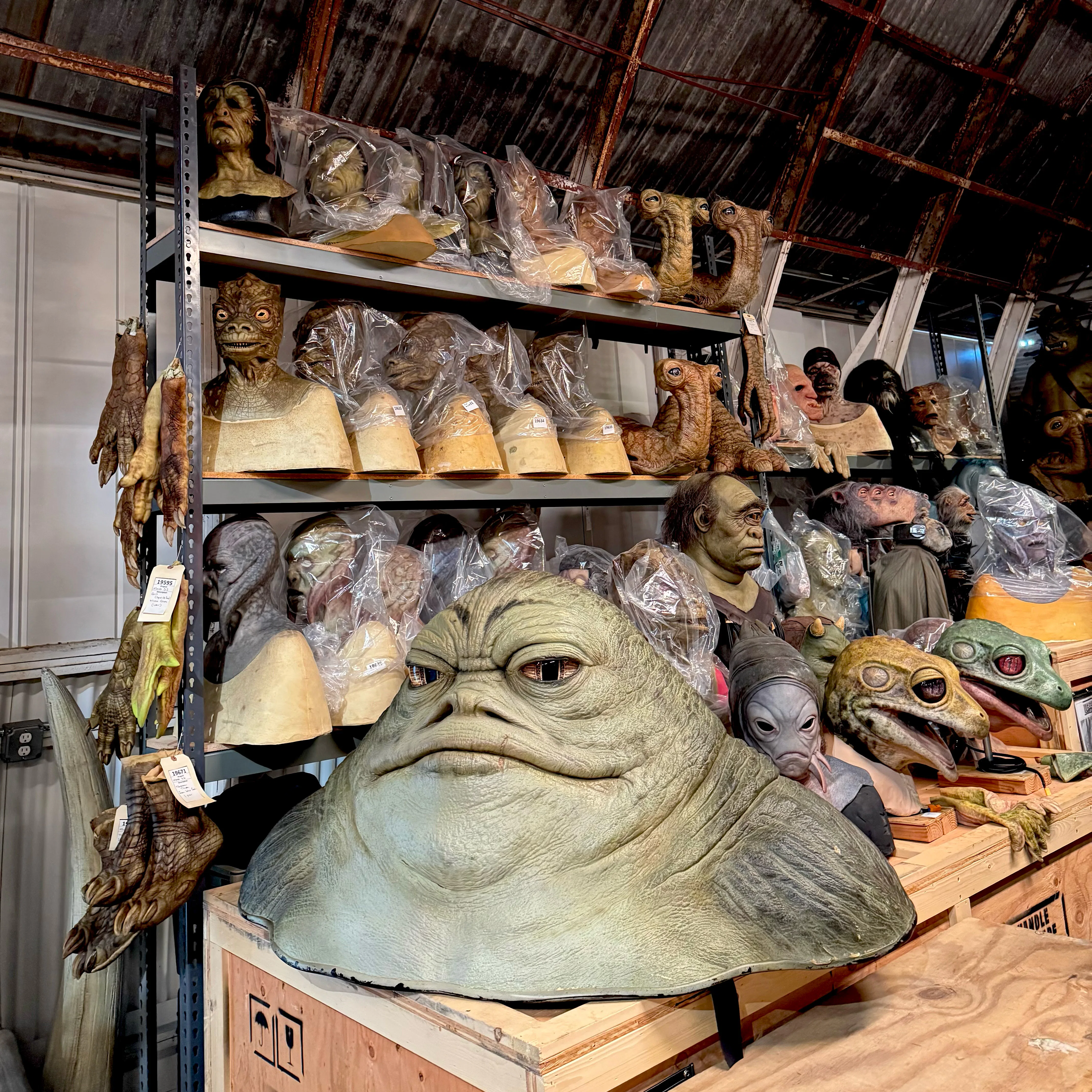 Золотая статуя Карла Уэзерса в роли Грифа Карги из Мандалорца охраняет вход в длинный коридор, заполненный предметами из этого сериала и других проектов Lucasfilm. Вы можете увидеть шлем Дина Джарина – даже с возможностью заглянуть внутрь – а также миниатюрные модели студий Фила Типпета и стену, покрытую мечами и копьями. Дорожка реквизита и оружия ведет к огромному ангару, заполненному еще больше предметов. Реалистичные головы персонажей, таких как Хатты и песчаные люди, кажутся следящими за вами, пока вы исследуете невероятную историю Lucasfilm.