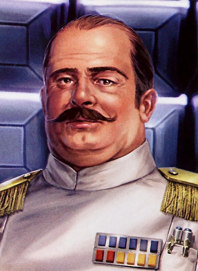 Это Зсиндж, имперский адмирал, ставший могущественным военачальником и фигурировавший во многих романах по Звёздным войнам в конце 1990-х годов. Он впервые появился в книге Ухаживания принцессы Леи и часто изображался врагом Хана Соло. Хотя Зсиндж описывался как имеющий зачёсанные назад волосы и заметные усы, военачальник в недавнем фильме лыс и чисто выбрит, немного похожий на дядю Фестера. Однако, насколько хорошо этот персонаж вписывается в общую историю и временную шкалу, важнее, чем его внешний вид.