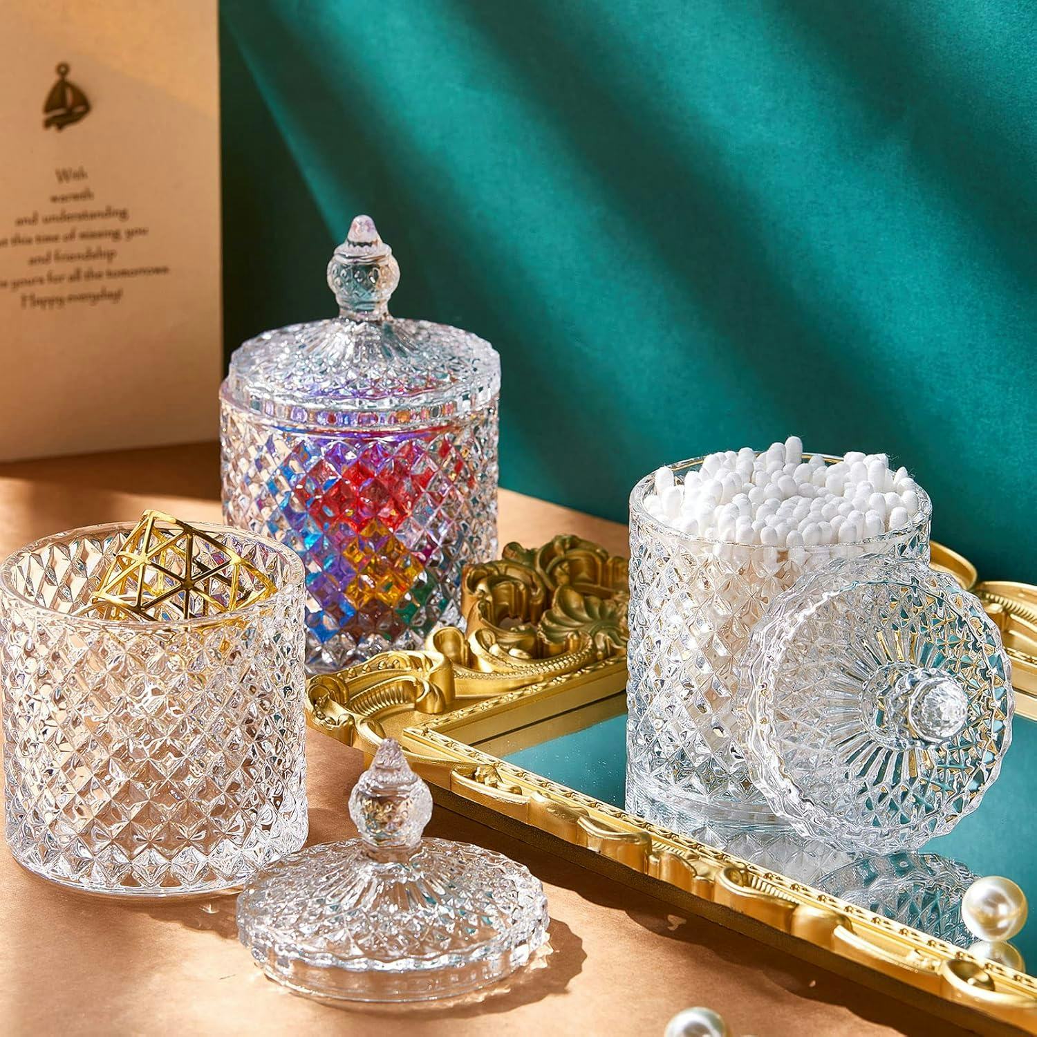 Сбор туалетных принадлежностей в стеклянных емкостях с огранкой, которые организуют и улучшают внешний вид.