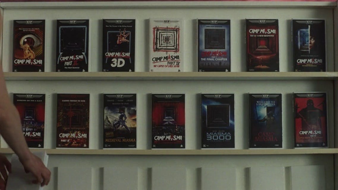 Окей, так трейлер сразу напомнил мне I Saw the TV Glow – он начинается с телевизора, который просто… светится! И шоу на экране кажется этим слэшером под названием Camp Miasma. Позже вы видите кучу VHS-кассет – целую полку! – включая Camp Miasma Part V: The Final Chapter (что, очевидно, ложь, там fourteen фильмов!), Medieval Miasma, и даже Miasma 3000. Очевидно, это большая штука в мире фильма.